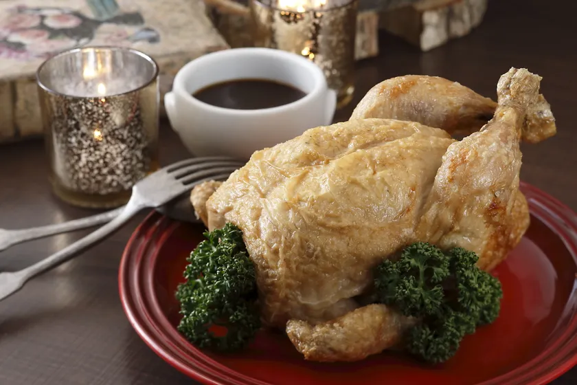 丸ごと焼き上げることで旨味が凝縮したローストチキン。深い味わいが広がる香ばしい一品です。