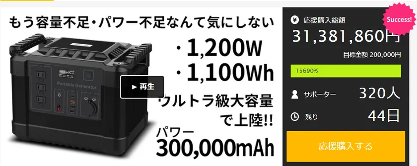 「ポータブル電源G1000」の支援額がMakuakeにて 3,100万円を突破 目標金額の15063%超え!