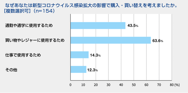 新型コロナウイルス感染症の拡大による影響で車の購入・買い替え意識に変化があったか聞いたところ、「購入・買い替えを決めた」人が7.5%で、昨年の4.9%よりも増えていることが判明した。一方、「購入・買い替えの予定を延期した」は2.3ポイントの減少、「購入・買い替えを中止した」人は0.9ポイント減少しており、昨年よりも新型コロナウイルスは買い控えよりも購入需要に影響していることがわかった。