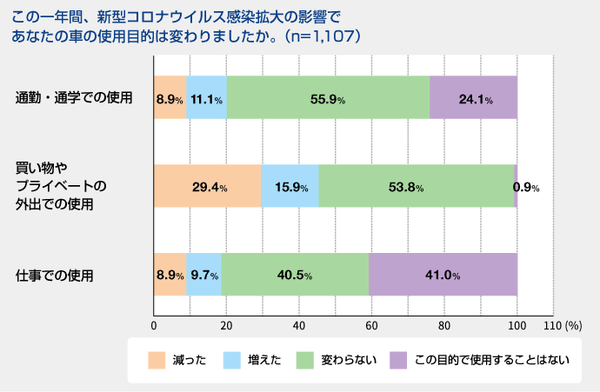 (3)車の使用頻度で変化が大きかったのは昨年に引き続き「買い物やプライベートでの使用」で45.3%。
