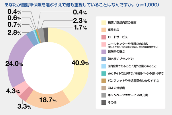 自動車保険を選ぶうえで最も重視していることを聞いたところ、最も多い回答は「補償/商品内容の充実(40.9%)」、次いで「保険料の安さ(24.0%)」、「事故対応(18.7%)」となった。