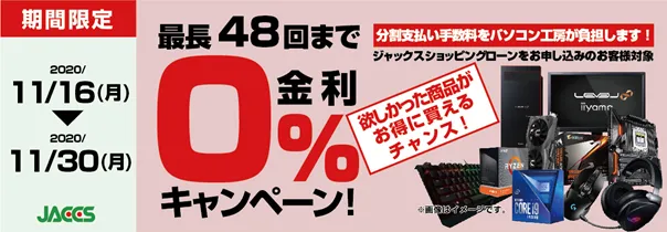 パソコン工房・グッドウィルを運営する株式会社ユニットコム(代表取締役:端田 泰三、本社:大阪市浪速区)は、パソコン工房 Web サイトおよび全国のパソコン工房・グッドウィル各店舗にて、ジャックスショッピングローンをご利用の場合、分割支払い金利手数料が最長 48 回まで無料になる『ショッピングローン 0%金利キャンペーン』を 2020 年 11 月 16 日(月)より開始しました。