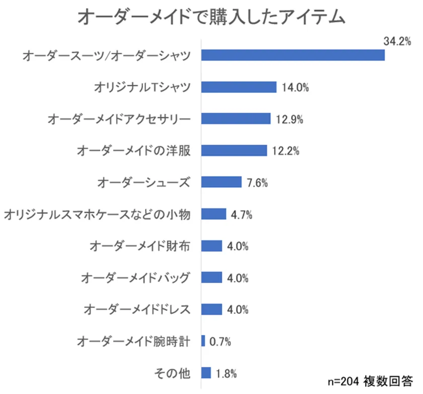 オーダーメイドでの購入経験者に、購入したファッションアイテムを聞いたところ、オーダースーツ/オーダーシャツが34.2%で1位となりました。