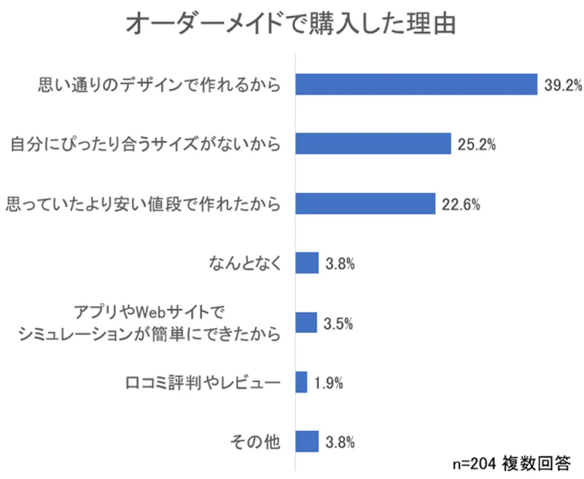 オーダーメイドで購入した理由の1位は「思い通りのデザインで作れるから」が39.2%と、自分だけのデザインが欲しいという回答が約4割となりました。