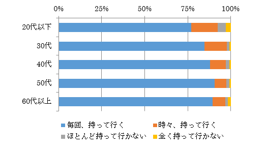 また、年代別でみると、年代があがるにつれ、エコバッグをもっていく率が高まっていることも分かりました。