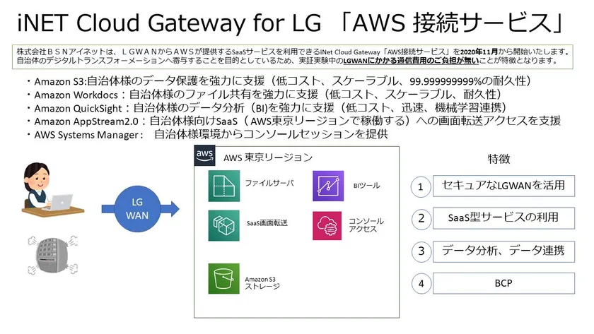 株式会社BSNアイネット(本社:新潟市、代表取締役社長:南雲 俊介、以下、BSNアイネット)は、LGWAN(総合行政ネットワーク)からアマゾン ウェブ サービス(以下、AWS)が提供するマネージド型サービスを利用できるiNET Cloud Gateway for LG「AWS接続サービス」を2020年11月から開始しました。