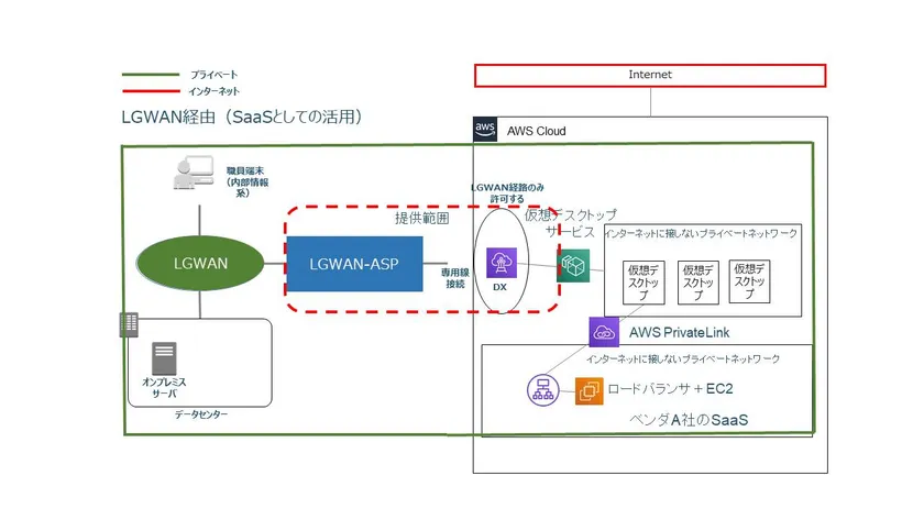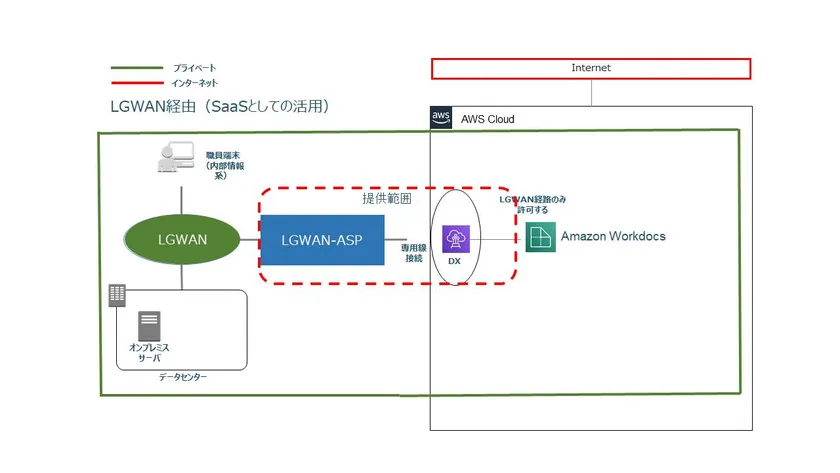 ●本サービスは、LGWANを通してAmazon Workdocsへの専用線接続を提供する。