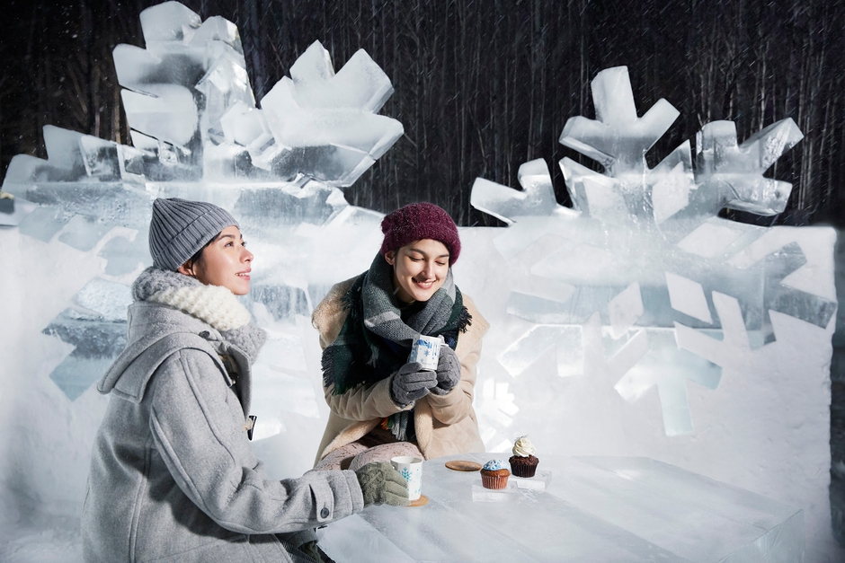 氷でできたテーブルとイスが設えてあるテラスです。テラスを囲む氷には雪の結晶をデザインしています。ここでは、テイクアウトしたドリンクなどをゆっくりと楽しんだり、幻想的な氷の世界を眺めて過ごしたりすることができます。