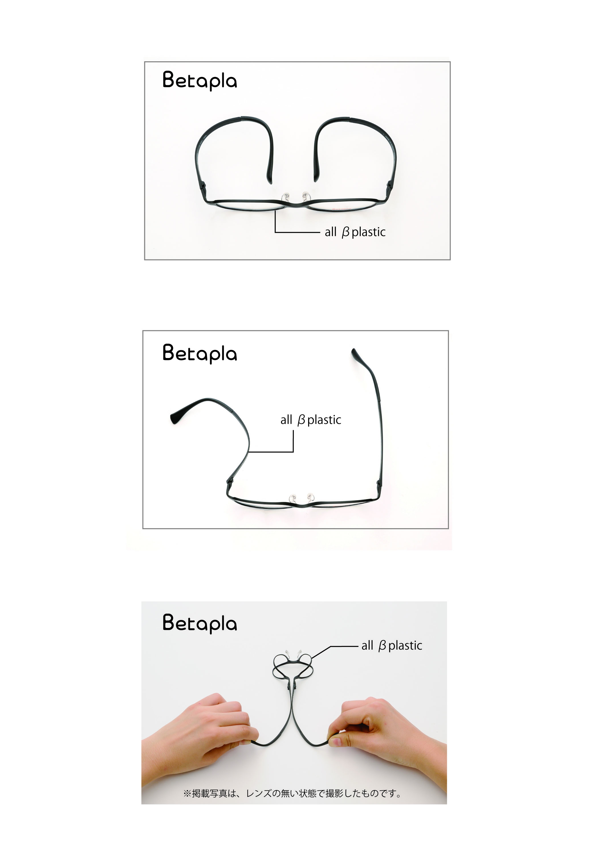 ベータプラと他社製品では、同じベータプラスチックで、「軽い」をコンセプトにおいたフレーム、「フィット感」を訴求したフレームは競合店様にもございますが、「BetaPla」それらとは全く違い「最軽量」7.3g(当社比較)と非常にお顔への負担の少ないフレームに仕上がっております。