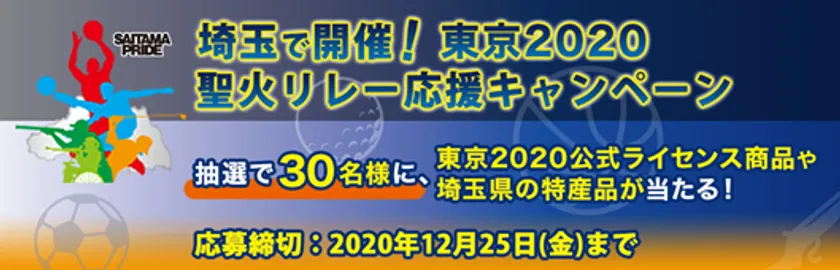 東京2020公式ライセンスグッズや県の特産品が抽選で30名様に当たる「埼玉で開催!東京2020聖火リレー応援キャンペーン」を実施します。