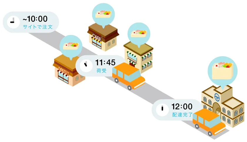 各飲食店は、当社が構築したサイトを通じて、指定の時刻までに入った注文をまとめて調理。