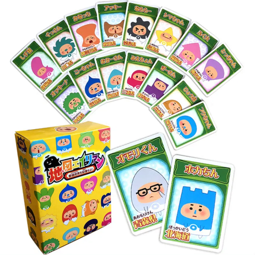 全国の都道府県をリズムに合わせて覚えられる人気アプリ「都道府県を記憶せよ~地図エイリアン~」のリアルカードデッキ。47人の可愛いキャラクターたちと一緒に都道府県名と都道府県の形を覚えることができます。