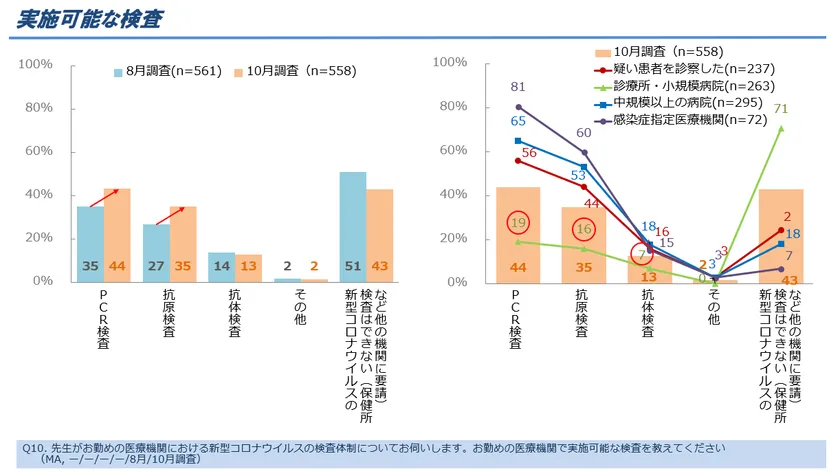 新型コロナウイルスの検査には「PCR検査」や「抗原検査」「抗体検査」など、いくつか種類があります。実施可能な検査についても尋ねたところ、「PCR検査」は8月(35%)→10月(44%)、「抗原検査」は8月(27%)→10月(35%)と、8~9ポイント増加しています。ただし、医療機関別に見ると大きな開きがあり、両検査は中規模以上の病院と感染症指定医療機関では過半数が実施可能であるのに対し、診療所・小規模病院では2割未満に留まります。かかりつけ医等医療機関への支援を強化し、「診療・検査医療機関」の指定を後押ししていくことが、より多くの患者に対応できる検査体制構築につながると考えられます。(図2)