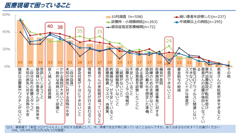 診療所・小規模病院では「感染対策が十分にできない」「患者の来院数が減っている」(各35%)、「検査ができない」(24%)が中規模以上の病院や感染症指定医療機関よりも相対的に高くなっています。また、疑い患者を診察した医師では「収入減による経営難」「診療にかかる負担が大きい」が約4割と、「確実な治療薬やワクチンがないこと」に次いで多く選択されています。感染対策の支援と併せて、診療・検査実施による診療上の負担や患者数減少といった経営上の懸念を払拭することが不可欠と言えそうです。(図3)