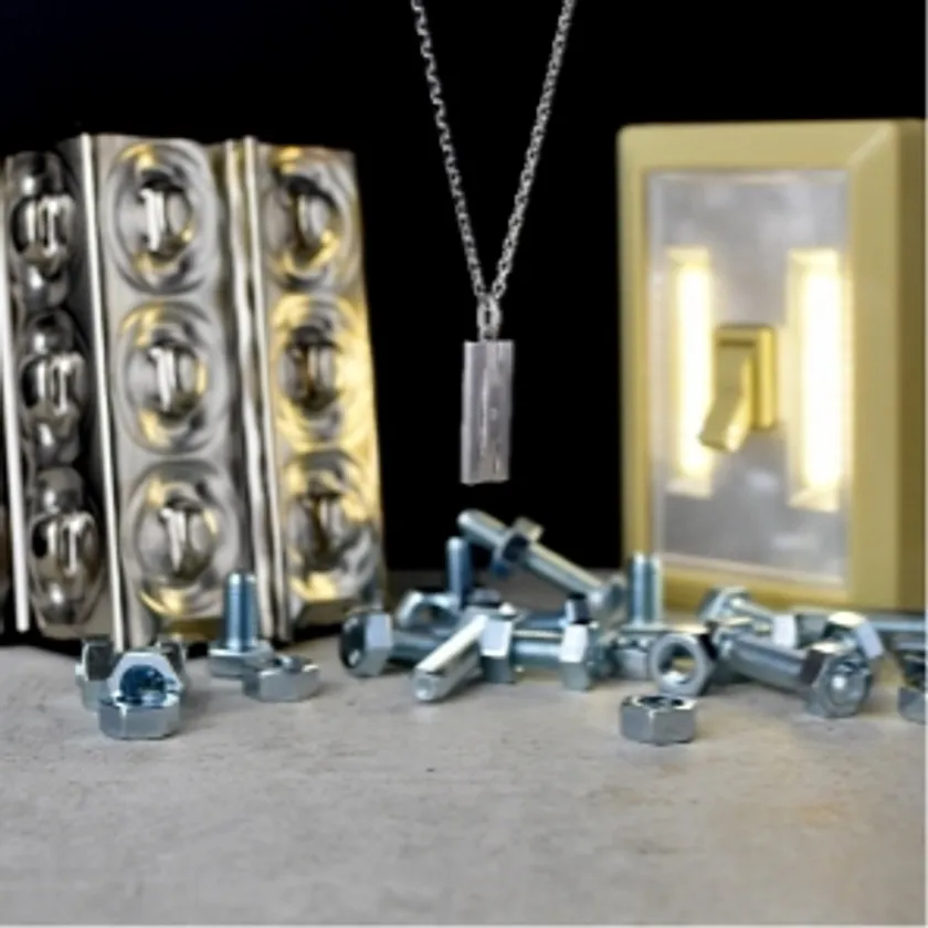 シンプルなシルエットのプレートに、ナットをモチーフにした多面体が乱反射するネックレス。