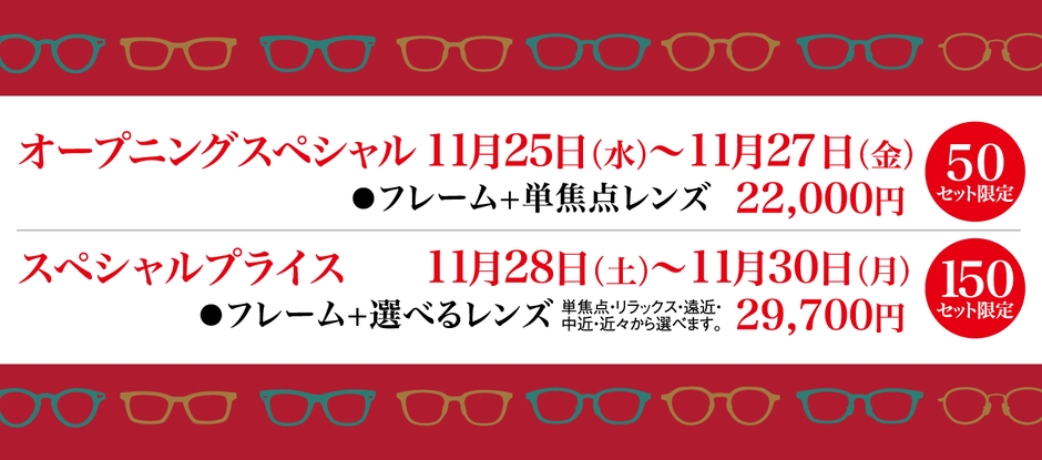 日替わりスペシャルプライスとして、フレーム+単焦点レンズセットを22,000円、フレーム+選べるレンズセットを29,700円でご用意いたします。※数に限りがございますので売切れの際はご容赦ください。※価格はすべて税込です。