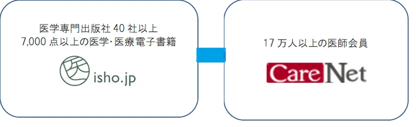 医書ジェーピーは、7,000点以上の医学専門書籍・雑誌の電子コンテンツを販売・配信するサービス「医書.jp」(URL https://store.isho.jp/ )を運営。ケアネットは、17万人以上の医師会員を有する医療・医学情報サイト「CareNet.com」(URL https://www.carenet.com )を運営し、アンケートなどに協力いただいた会員にケアネットポイントを発行しています。