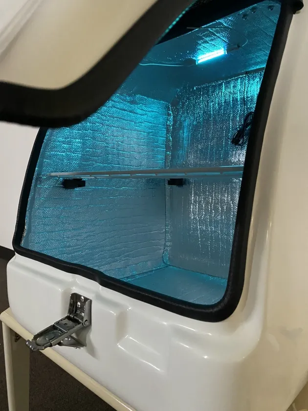 紫外線UV-Cランプは人体への影響等配慮が必要な光でもあります。その為、デリバリーボックスが閉じている間に動作し、デリバリーボックスを開けると切れる電磁スイッチを採用する事でアルバイトであっても安全に使用する事が出来るよう配慮した構造となっています。