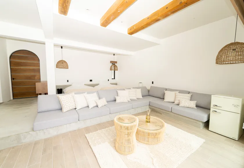 ベッドルーム&リビング&プールがひとつの流れで設計された、グランブルーギャマンのコンセプトルーム。プールからそのままバスルームに入れる空間も開放感満点。