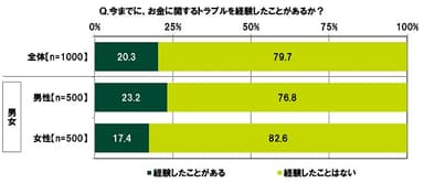 全回答者(1,000名)に、今までに、お金に関するトラブルを経験したことがあるか聞いたところ、「経験したことがある」は20.3%、「経験したことはない」は79.7%となりました。