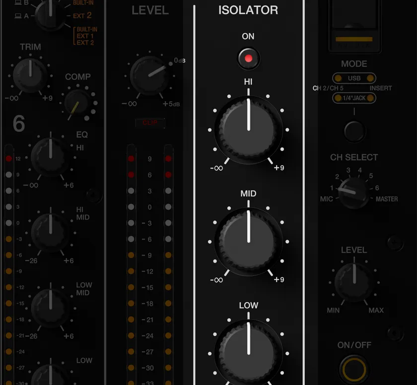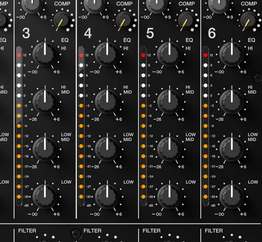 各チャンネルに搭載したコンプレッサーにより、ノブを調整することで、すぐに音圧を調整することができます。音量調整だけでは困難とされていたミキシングやマスタリング状態の異なる音源をより自然にミックスすることができます。