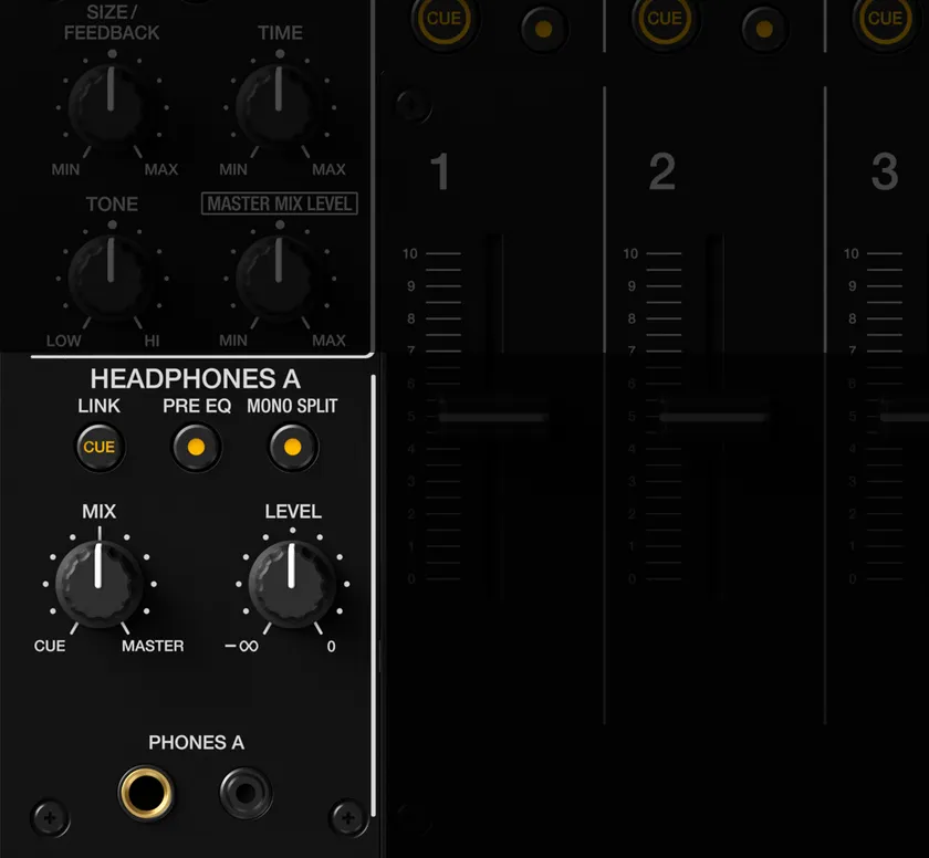 ヘッドホンCUEボタン、音量ノブ、MIXバランスノブを2系統搭載しました。完全独立の2つのヘッドホンセクションにより、複数のDJが交互に曲をかけるBack to Backスタイルにおけるモニタリングをより快適に行うことができます。