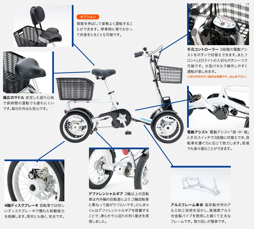 「けんきゃくん」は、協栄製作所が開発をした国内初の電動アシスト4輪自転車。自転車で事故が一番多い低速走行時や発進停止時にもふらつかず、足をペダルに乗せたまま停止ができ、斜面に停車しても転倒する危険が少ない4輪のレイアウトを採用しています。