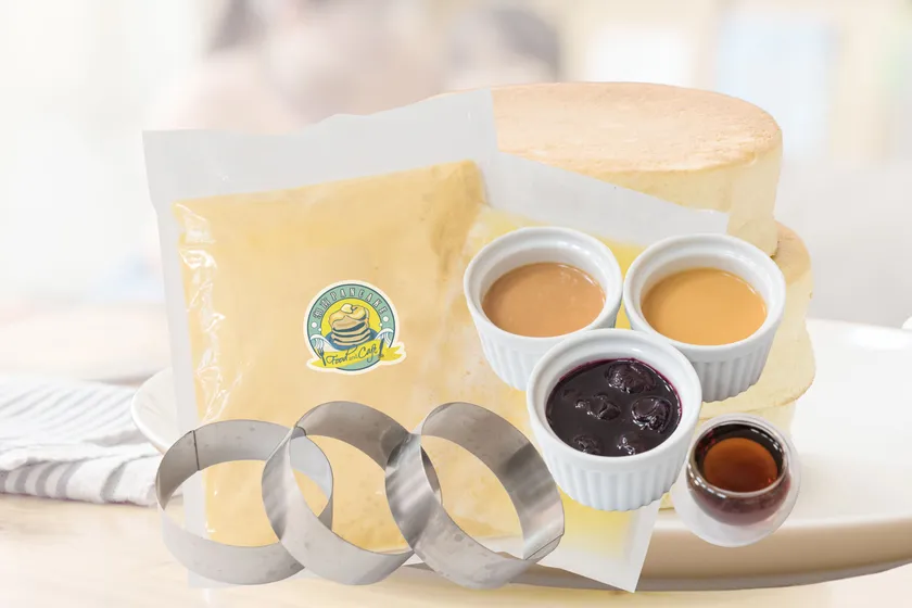 冷凍されたパンケーキ生地(アパレイユ)に付属の卵白でメレンゲを立て、混ぜ合わせるだけで、生地が完成しますので、簡単にお店と同じ味の本格的スフレパンケーキが作れます。また、家族や友人、恋人やお子様とホットプレートを囲みながら焼き上げる工程も楽しんでいただけます。