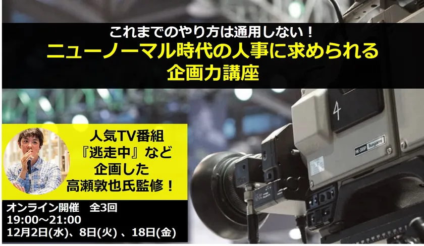 そんな時代に求められるのが目的に応じて魅力的なコンテンツを生み出す“企画力”です。本講座は、大人気番組「逃走中」などを企画したヒットコンテンツメーカー高瀬敦也氏監修のもと、お二人のプロデューサーをゲストスピーカーとしてお招きし、豊富な体験談から具体的なヒントを得ながら、ニューノーマル時代に必要な企画力を高めていきます。