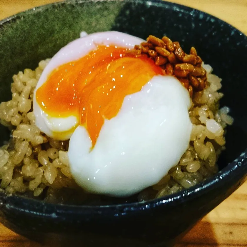 温泉卵の濃厚な黄身に旨味のある醤油麹がよく合います。もっちりと圧力鍋で炊いた玄米ごはんにかけてどうぞ。