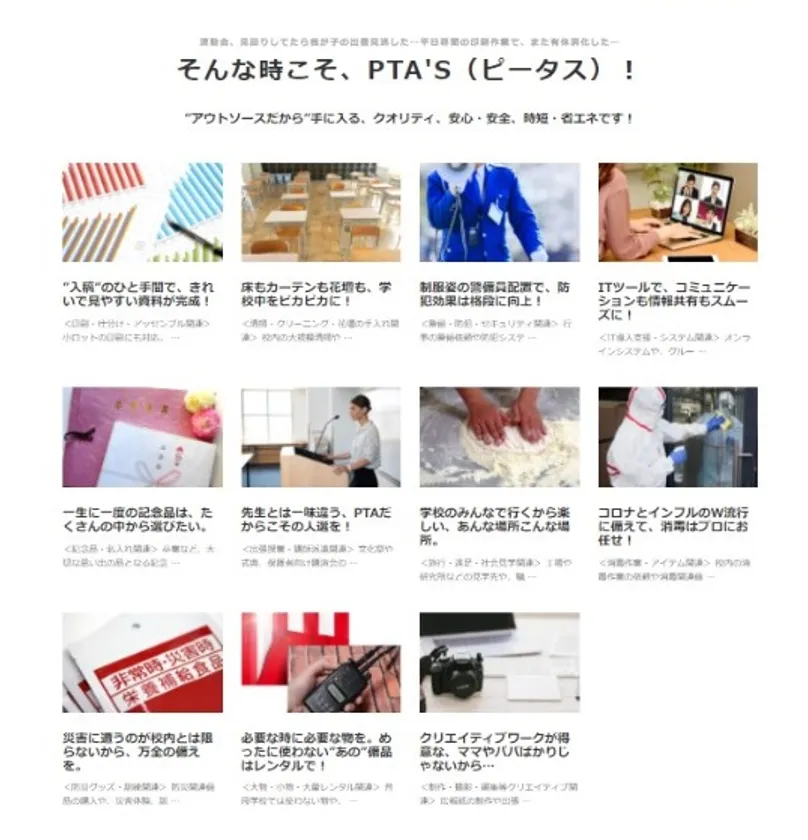PTAには、子ども・保護者・学校など、それぞれにかかわる活動と業務があります。PTA'S(ピータス)では、それらPTAに欠かせない業務を以下の「業種カテゴリー」と、「対応可能エリア」で、的確かつ簡単に検索でき、複数企業の比較検討も可能です。また、「運動会」といったキーワードで、用途別に検索することもできます。