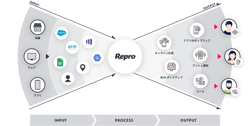 「Repro」は企業と顧客のつながりや関係性を強化するエンゲージメントマーケティングが実行可能なCE(カスタマーエンゲージメント)プラットフォームです。