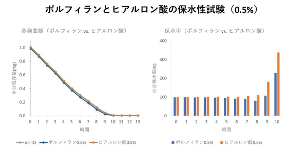 株式会社西部海苔店と近畿大学薬学部の多賀淳教授との共同研究により、保湿性を有するポルフィランが熱で分解されないよう(保湿効果が損なわれないよう)凍結乾燥により抽出し、水で薄めていない高純度の固体状態のまま贅沢に配合することが可能となりました。また、海苔由来のポルフィランは肌に優しい弱酸性の処方にも利用でき、ヒアルロン酸と比べて「ベタつき」が少なく「サラッ」とした使用感があり、ヒアルロン酸に迫る保水性が示されました(右グラフ)。