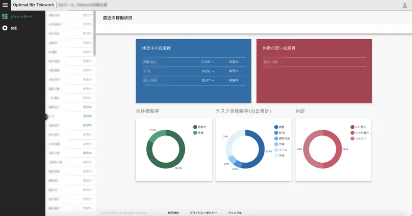 「Optimal Biz Telework」とは、テレワーク環境下においてコミュニケーションサポート、業務サポート、生産性向上サポートを実現する、テレワーク支援サービスです。本サービスを利用することで、従業員の稼働状況を確認することができ、いつ、どこで、だれが、どのような業務をしているかを可視化することができます。