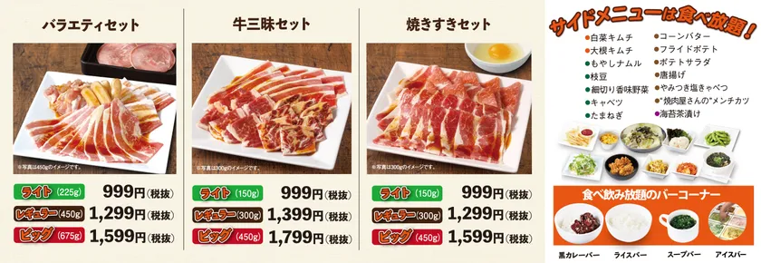 牛肉、豚肉、鶏肉をバラエティに盛り合わせた「バラエティセット」、ランチタイム限定の人気の牛肉3種盛り「牛三昧セット」、すき焼き風に焼肉を楽しめる「焼きすきセット」の3種のメニュー。女性におすすめの「ライト」、男性におすすめの「レギュラー」、がっつりお肉を楽しめる「ビッグ」の3つのボリューム。このように、お肉の種類と量をその時の気分に合わせてご注文いただけます。