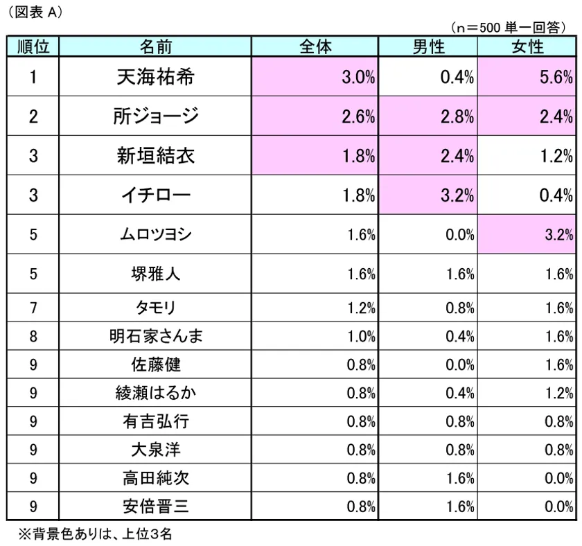男女別に集計したところ、男性では1位が「イチロー」(男性回答率3.2%)となり、2位「所ジョージ」(同2.8%)、3位「新垣結衣」(同2.4%)と続きました。一方、女性では1位が「天海祐希」(女性回答率5.6%)となり、2位「ムロツヨシ」(3.2%)、3位「所ジョージ」(同2.4%)という順位になりました。
