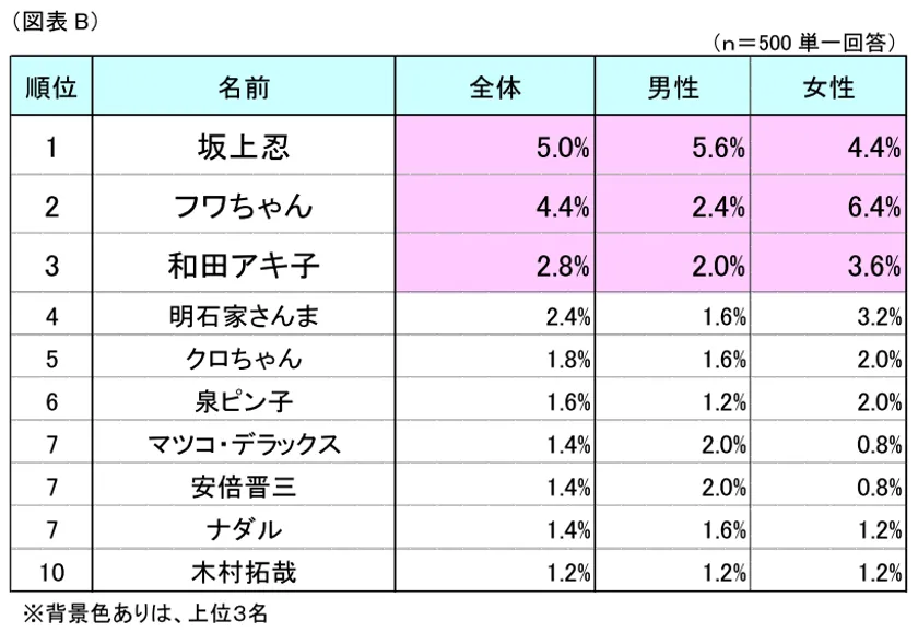男女別に集計したところ、男性では1位が「坂上忍」(男性回答率5.6%)となり、2位「フワちゃん」(同2.4%)、3位「和田アキ子」(同2.0%)と続きました。一方、女性では1位が「フワちゃん」(女性回答率6.4%)となり、2位「坂上忍」(同4.4%)、3位「和田アキ子」(同3.6%)という順位になりました。
