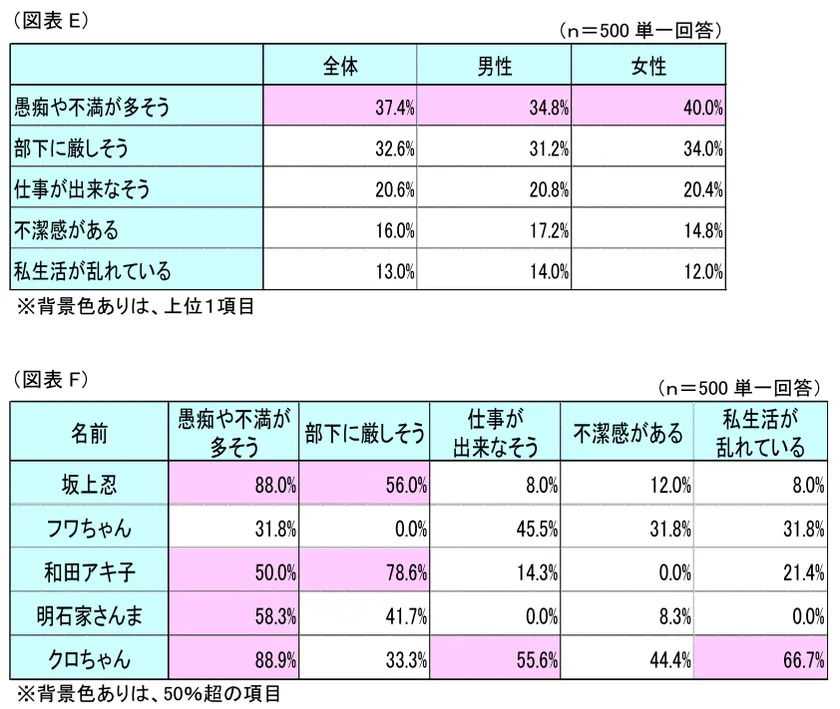 (2)のランキング上位者に対して理由を集計したところ、1位の「坂上忍」に対しては「不満や愚痴が多そう」(同88%)、「部下に厳しそう」(同56%)という意見が多く、2位の「フワちゃん」では「仕事が出来なそう」(同45.5%)、3位の「和田アキ子」では、「部下に厳しそう」(同78.6%)という意見が最も多い結果となりました。ランキング上位者における一緒に働きたくないと思う理由として、多少の相違はあるものの「愚痴や不満が多そう」という意見が総じて高い傾向にあることから、一緒に働きたくない人のイメージとして重視されていることが表れているといえるでしょう。(図表F)