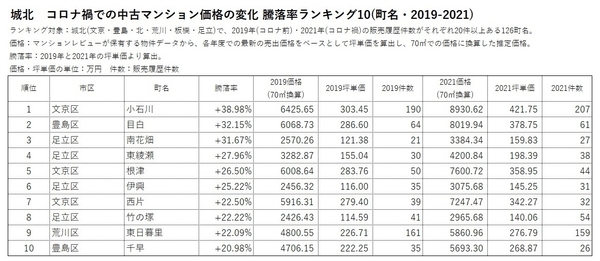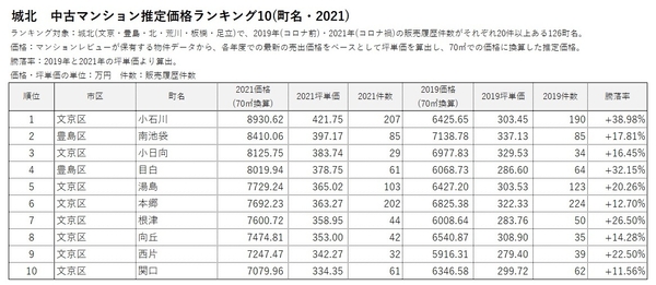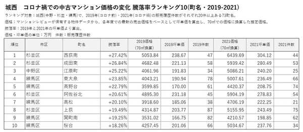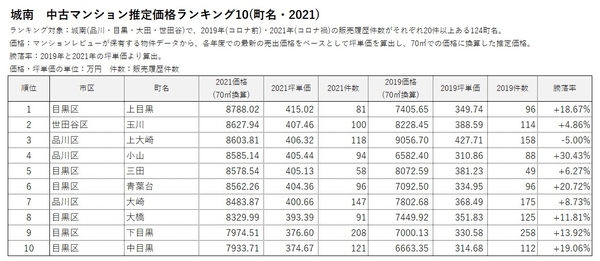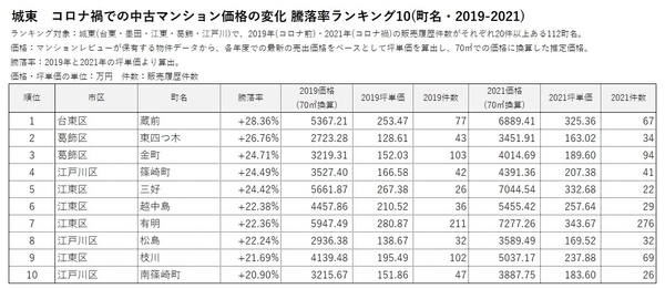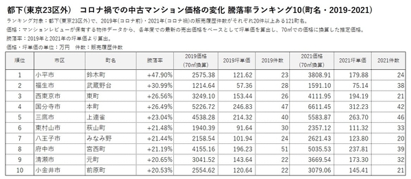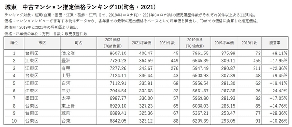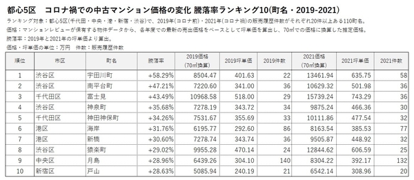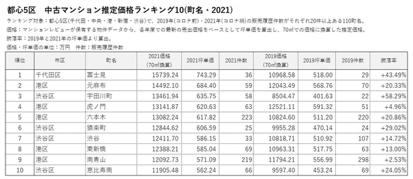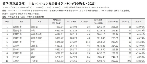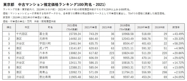「マンションレビュー」のデータで見る「コロナ禍での東京 中古マンション相場推移」 騰落率&推定価格の町名ランキングを発表