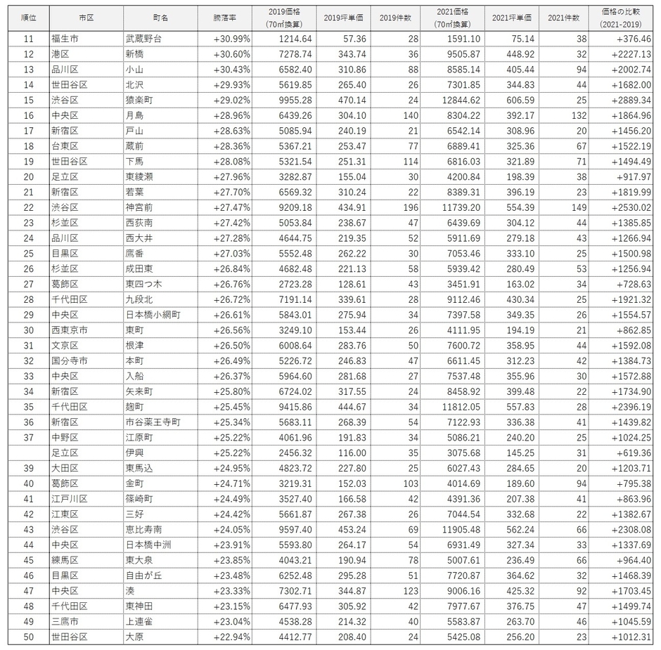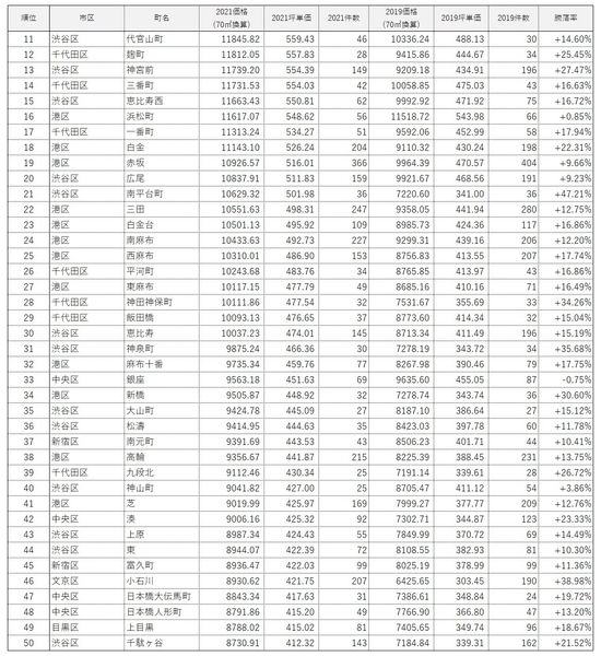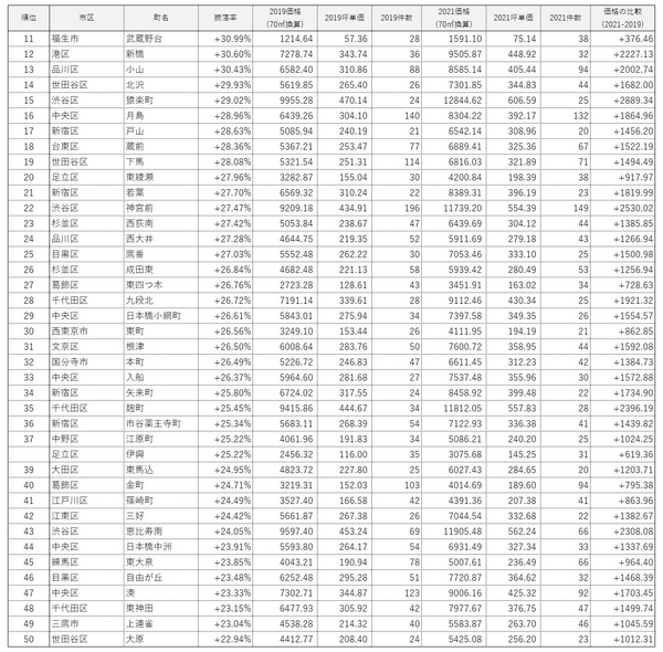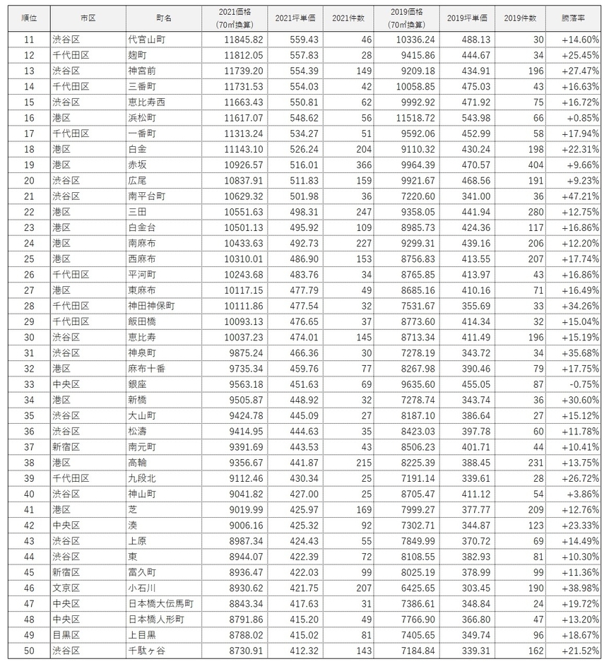 ・1位は「渋谷区宇田川町」の+58.29%。70㎡換算推定価格は1億3,461万9,400円で、コロナ前の2019年と比較して約5,000万円上昇。2020年竣工の「パークコート渋谷ザ タワー」が相場を大きく牽引した。