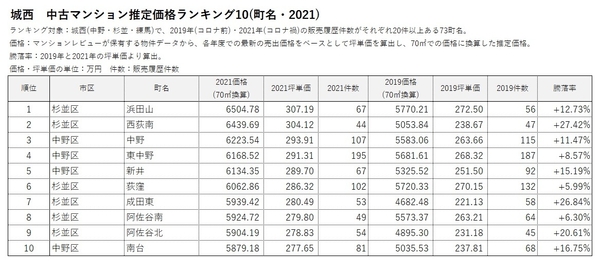 ・上位10位のうち、杉並区の町名が6町名を占めた。