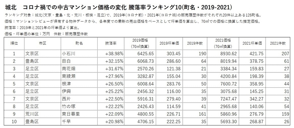 「不動産×WEB×ビッグデータ」の領域で、さまざまな不動産テックサービスを展開する株式会社ワンノブアカインド(本社:東京都港区、代表取締役社長:川島 直也、以下当社)は、当社が運営するマンション情報サイト「マンションレビュー」の保有データを元に、いわゆる「コロナ禍」での東京都の中古マンション価格1の変動について調査。新型コロナウイルス感染症の発見・影響が出る前の2019年と、感染拡大から1年が経過した2021年の坪単価を元に、価格の上昇率をあらわす「騰落率」を「町名」単位で集計したランキング2について、推定価格のランキングとあわせて発表いたします。