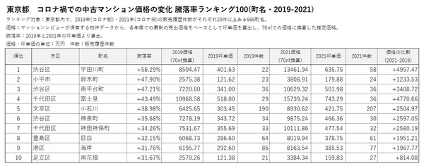 ■東京都 コロナ禍での中古マンション価格騰落率ランキング100 (2019-2021)