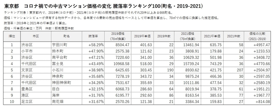 ■東京都 コロナ禍での中古マンション価格 騰落率ランキング100 (町名・2019-2021)