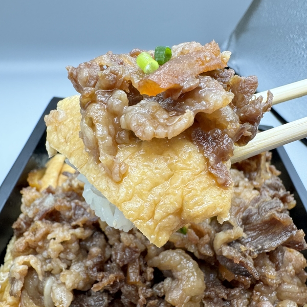 たっぷり1枚分入ったお揚げと牛しぐれ煮をお箸でほぐして一緒に食べると、見た目はお弁当だけど食べたら伊奈利寿司のお味に!