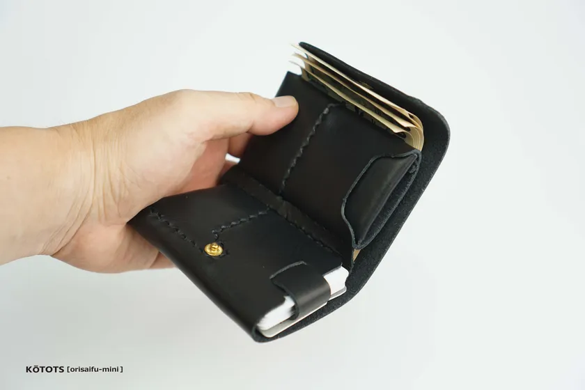 「オリサイフ-ミニ」は極小サイズに紙幣+コイン+カードを絶妙に収納したキャッシュレス時代にふさわしいフルスペックのミニマムレザーウォレットです。
