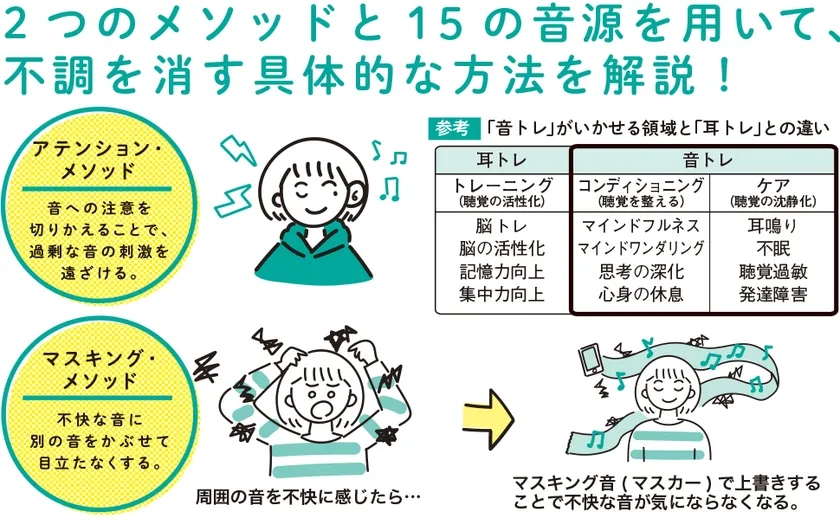イヤな音に別の音をかぶせることで、心理的に不快感を減らす方法。本書では、各症状に適切な15の音源を制作し、QRコードやURLの入力でパソコンやスマホ、タブレットなどの端末で聞けるようにしている。