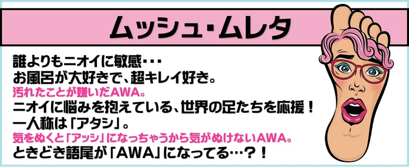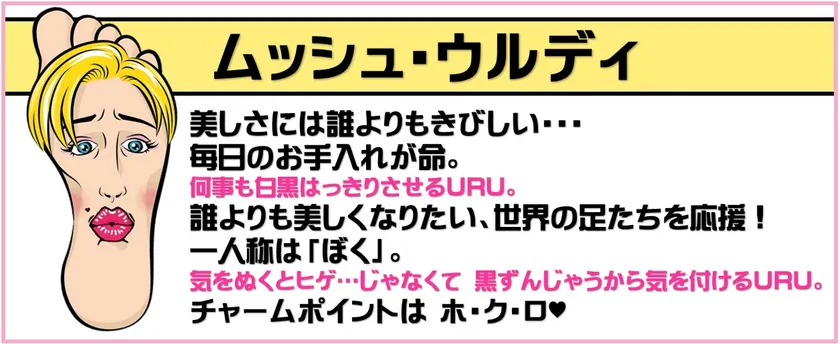 新ファミリー ムッシュ・ウルディは気になる「黒ずみ」や「うるおい不足」の足たちを救う美容オタクな足裏として誕生しました!