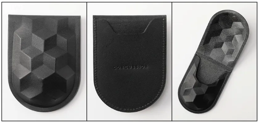 「Techno Leather Craft Projectは、3D CADと3Dプリンタを活用した、オリジナルのレザー加工技法です。コンピューター上で設計した型を3Dプリンタで出力し、ナチュラルレザーにプレスして立体的な形状を成形しています。この技法を活用しコインケースを作成しました。見た目の面白さだけでなく、皿型形状でコインの出し入れが容易となっている等、機能面も熟慮した造形となっています」
