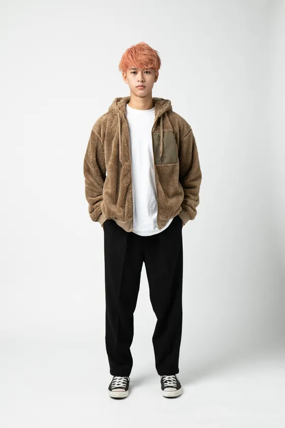 ラフなベージュのモコモコフリースボアパーカーにはクロのワイドテーパードパンツで。